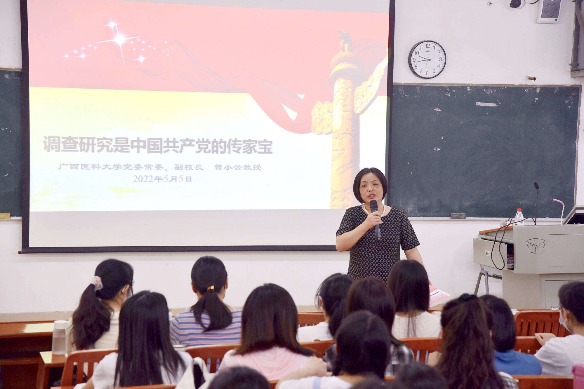 在授课中,曾小云教授基于自身预防医学调查研究成果,结合百年党史,围绕调查研究的目的、作用与方法,用生动的教学案例为同学们讲解了“为什么要开展调查研究、调查研究是什么、如何开展调查研究”,特别是在中国共产党调查研究工作方法的历史渊源中,帮助同学们深刻认识到调查研究在中国共产党领导中国人民进行革命、建设和改革的过程中的重要意义。