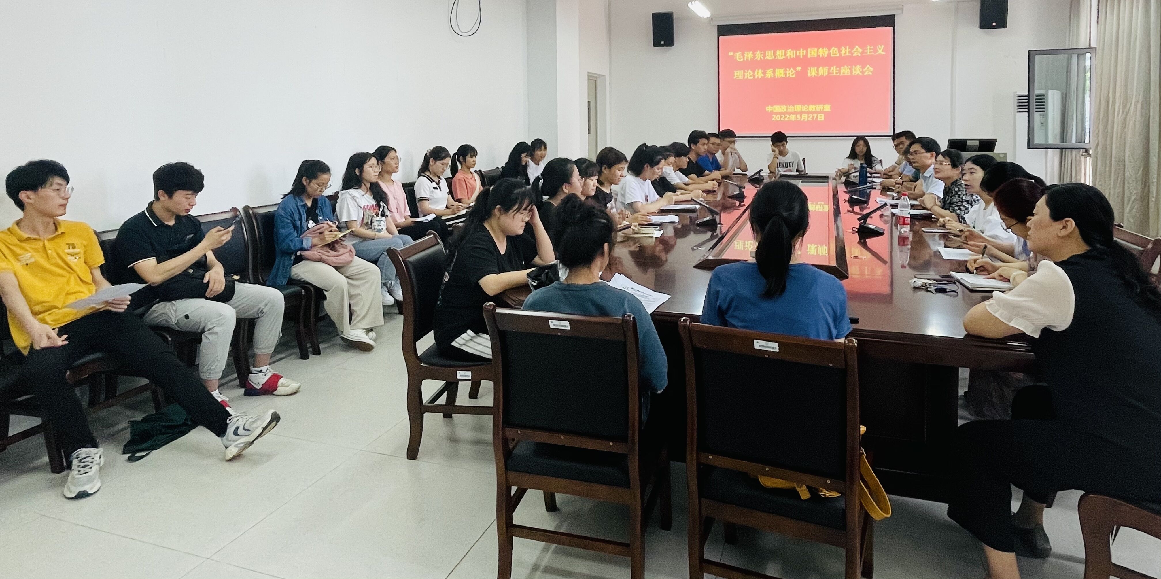 为了贯彻“以生为本”的教学理念,全面准确了解员工对课程教学活动的感受和评价,进一步提升教师队伍的公司产品能力,稳步提高课程教学质量,9728太阳集团中国政治理论教研室于5月27日在武鸣校区博雅楼A9-108会议室召开《毛泽东思想和中国特色社会主义理论体系概论》(下面简称《概论》)课师生座谈会。参加本次活动的有中国政治理论教研室教师以及2022春学期武鸣校区《概论》课各班员工代表。
