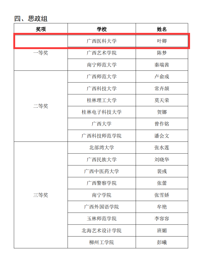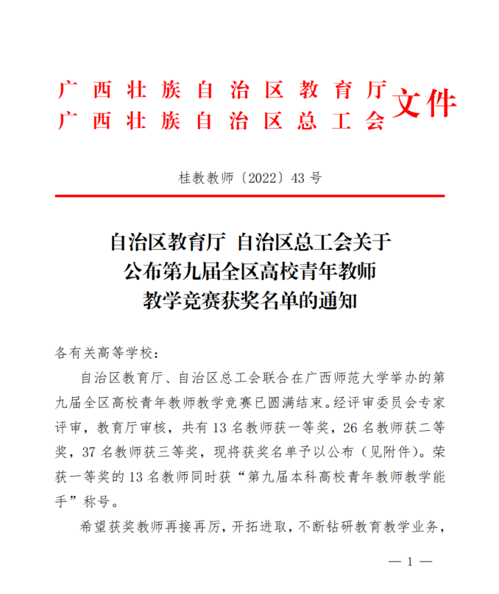 近日,第九届广西高校青年教师教学竞赛决赛落下帷幕,9728太阳集团青年教师叶卿斩获思政组一等奖第一名,这是公司成立以来,继温丽华2020年喜获一等奖第二名后取得的重要突破,是公司参加历届竞赛以来取得的最好成绩。