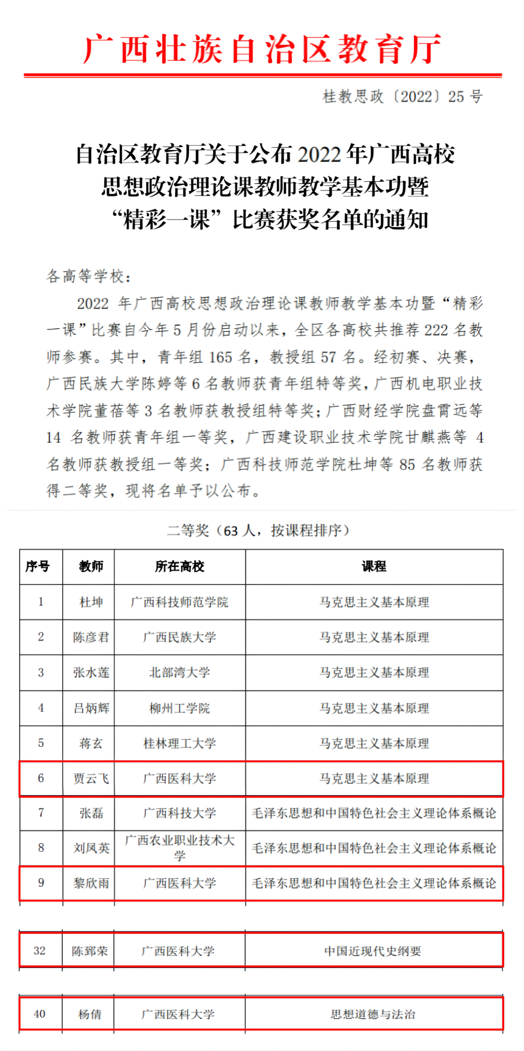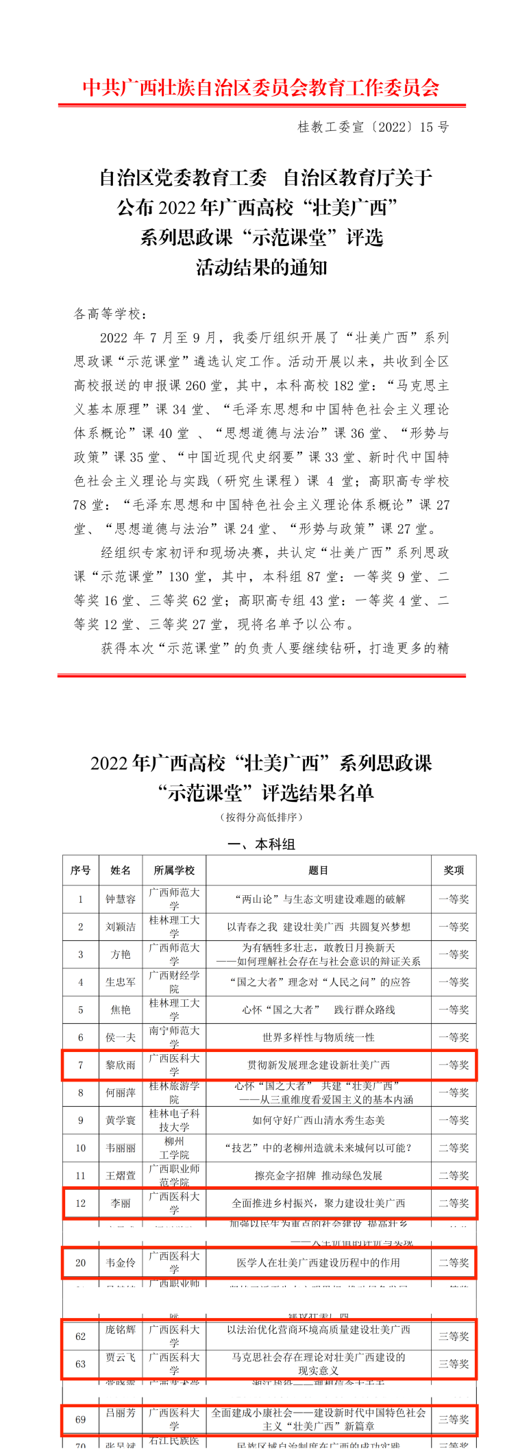 日前,自治区教育厅公布了2022年广西高校“壮美广西”系列思政课“示范课堂”评选活动结果和2022年广西高校思想政治理论课教师教学基本功暨“精彩一课”比赛获奖名单。公司共有6堂“壮美广西”系列思政课示范课堂获奖,其中,一等奖1堂,二等奖2堂,三等奖3堂;有4名教师在“精彩一课”中获奖,均为二等奖。