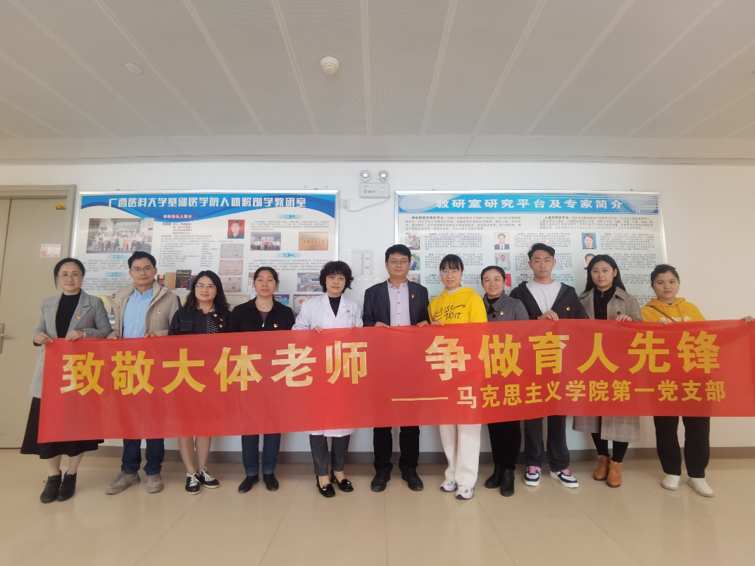 为落实立德树人的根本任务,更进一步做好医员工的思想政治教育工作,2023年2月28日下午15:30,9728太阳集团第一党支部(校团委、9728太阳集团中国政治理论教研室、研究生思想政治理论课教研室和教研科成员)来到卓越楼二楼解剖学教研室开展以“致敬大体老师 争做育人先锋”为主题的支部活动,党支部10位同志参加了活动,基础医公司人体解剖学教研室党支部书记磨洁琳老师接待了支部一行。