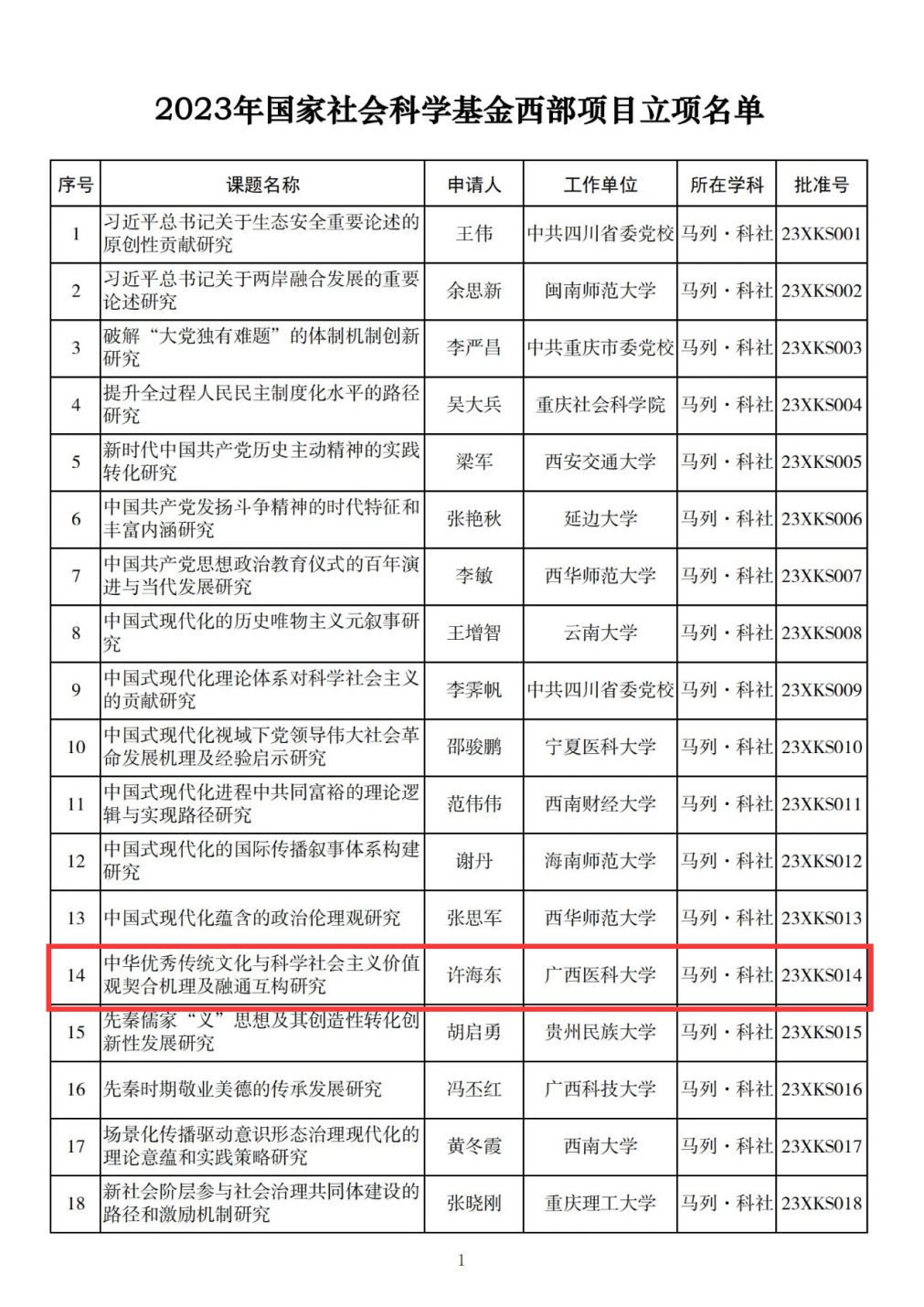 近日,全国哲学社会科学工作办公室公布了2023年度国家社会科学基金项目立项名单,公司专职思政课教师许海东副教授申报的“中华优秀传统文化与科学社会主义价值观契合机理及融通互构研究”获批2023年度国家社会科学基金西部项目,这是继公司思政课教师王前强教授、杨海秀教授、陈会方教授获批国家社会科学基金项目后的又一立项,也是9728太阳集团在获批一级学科硕士学位授权点以来取得的又一重要成绩。