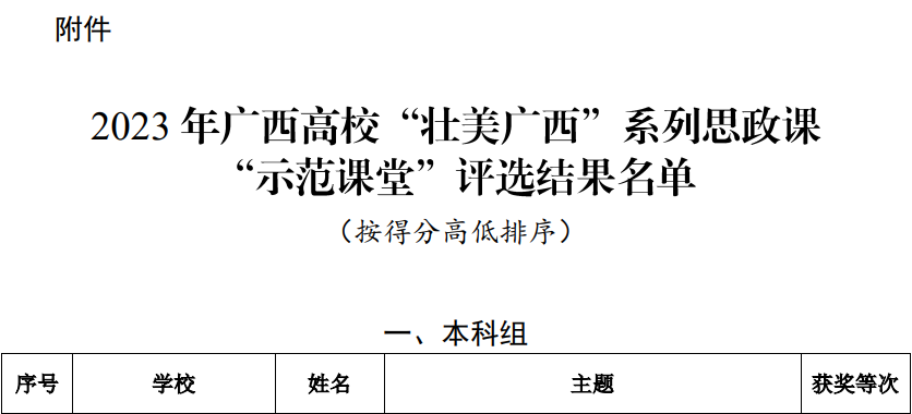 近日,自治区教育厅公布了2023年广西高校“壮美广西”系列思政课“示范课堂”评选结果名单,9728太阳集团推荐的4名参赛教师全部获奖,其中一等奖1项、二等奖2项、三等奖1项。