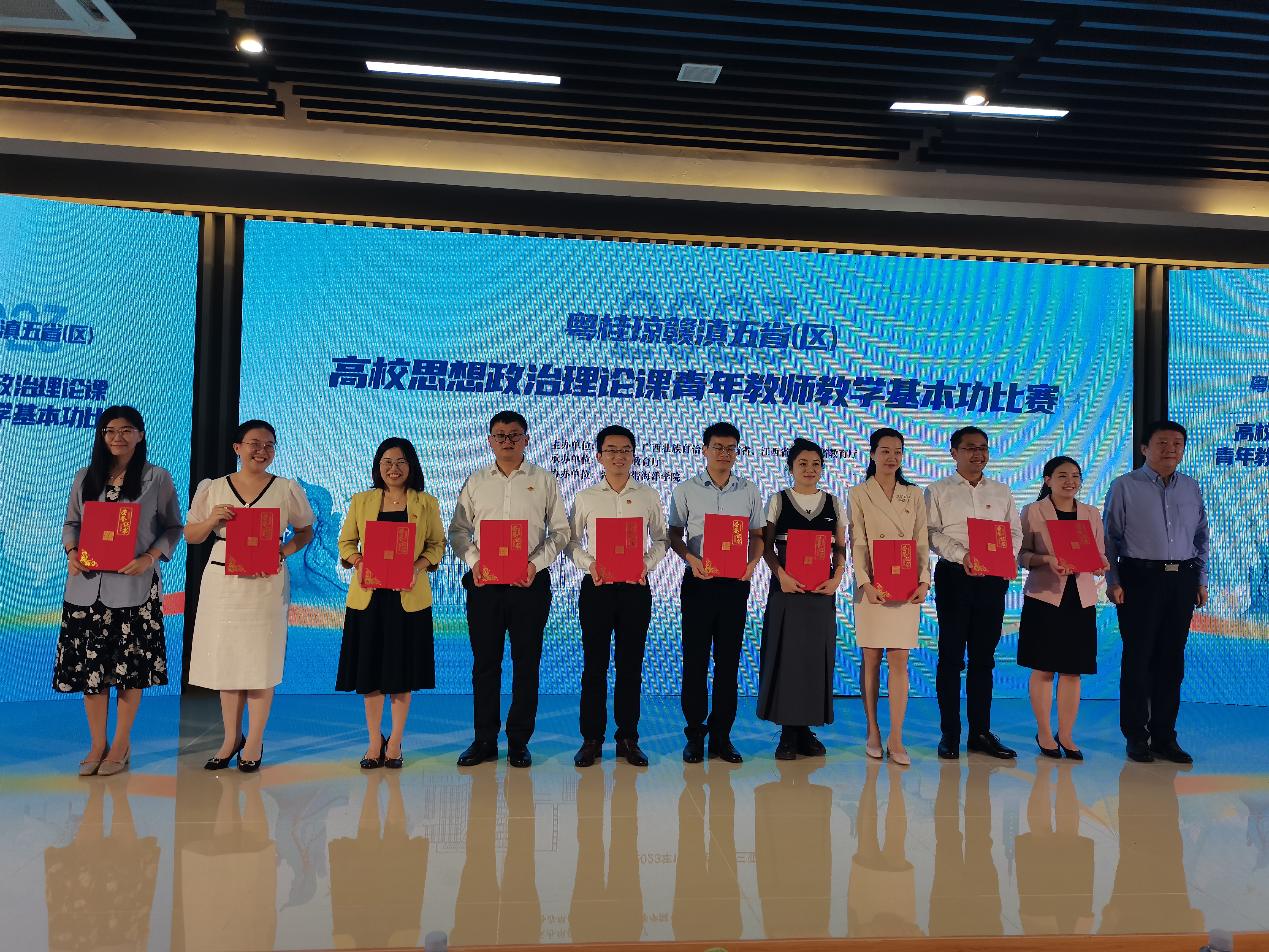 据悉,粤桂琼赣滇五省(区)高校思想政治理论课青年教师教学基本功比赛是由五省(区)教育厅联合举办。自治区教育厅高度重视,组织全区思政课“精彩一课”比赛2021年、2022年、2023年获得最高等次奖项的教师和2023年全国高校思政课教师教学展示推荐参展教师参加赛前培训和选拔。在公司的大力支持下,公司温丽华老师通过遴选并代表广西参加决赛,主讲“习近平新时代中国特色社会主义思想概论”课程。经过激烈角逐,温丽华老师以突出的专业能力和过硬的职业素养荣获本科组一等奖。