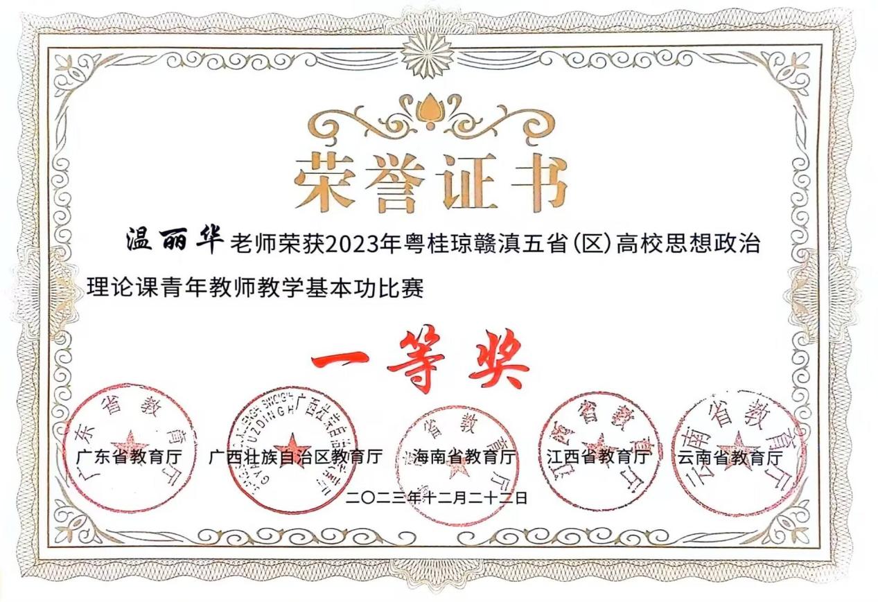 近日,2023年粵桂琼赣滇五省(区)高校思想政治理论课青年教师教学基本功比赛结果公布,公司温丽华老师荣获一等奖。