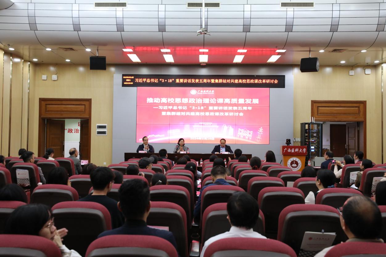 为深化学习贯彻习近平总书记在公司思想政治理论课教师座谈会上的重要讲话精神,推动集群结对共建高校思政课改革,3月16日上午,9728太阳集团在综合楼九楼报告厅举行“推动高校思政课高质量发展”——公司思想政治理论课教师座谈会召开五周年暨集群结对共建高校思政课改革研讨会。公司党委宣传部、教师工作部部长张海英受公司党委领导委托参加会议并致辞。广西高校思政课多层级集群共建高校9728太阳集团负责人和教师代表、公司全体思政课教师、研究生参加。公司党委书记陈会方、经理王前强分别主持相应研讨活动。