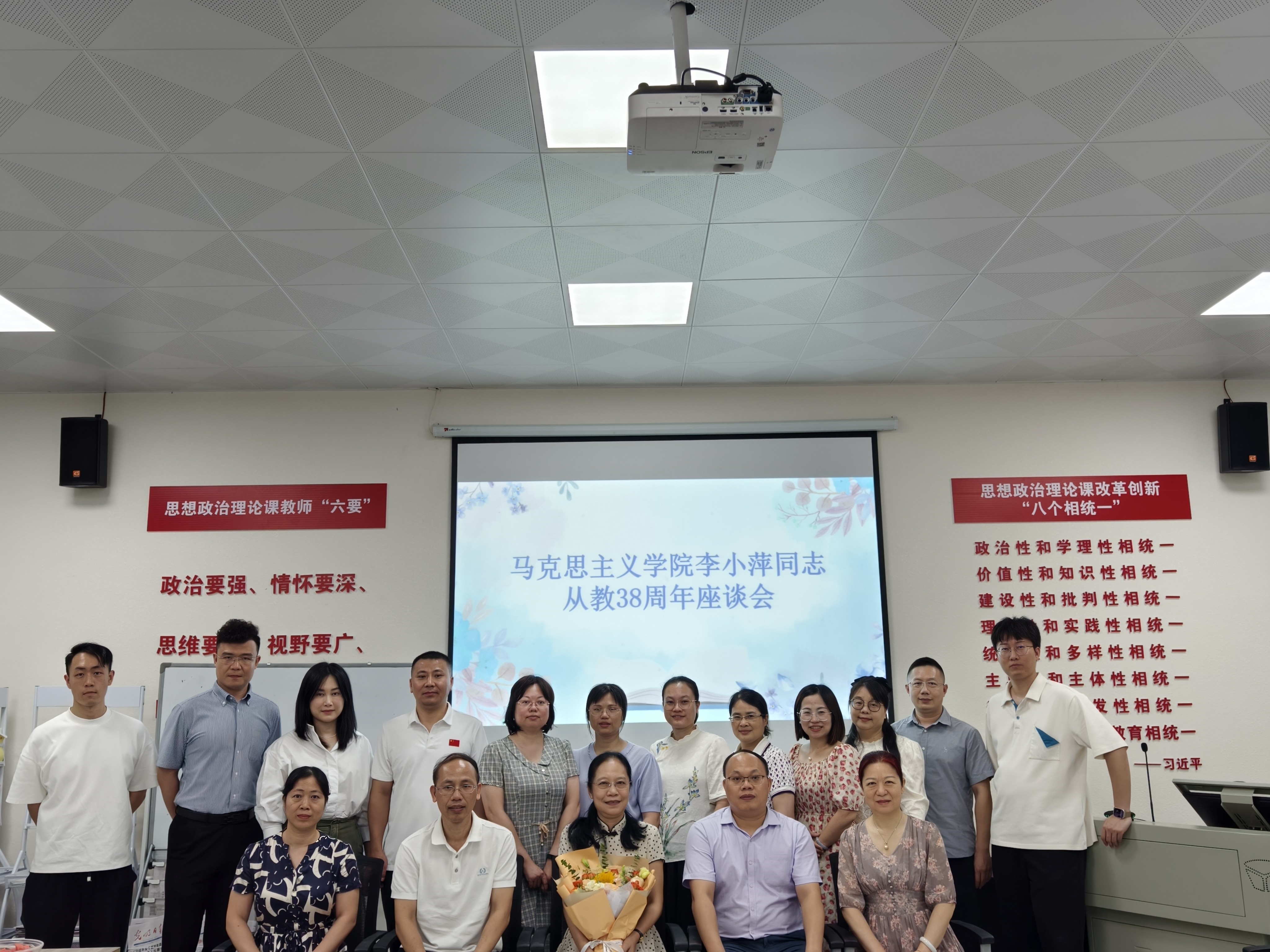 在热烈的掌声中,李老师将象征“接力棒”的《思想道德与法治》教材传递给了现任教研室副主任覃小妮老师手中。她希望教研室继续发扬优良传统,不断创新,为培养更多担当民族复兴大任的时代新人贡献力量。